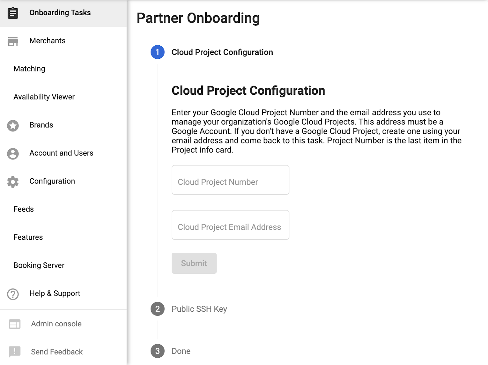 - Hoàn tất bước 1 trên trang Việc cần làm khi bắt đầu sử dụng của Cổng đối tác bằng cách gửi mã dự án trên đám mây và địa chỉ email của dự án trên đám mây (địa chỉ email dùng để quản trị dự án trên đám mây).