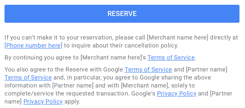 La URL a la que se vinculará se encuentra en la parte inferior del modal Crear reserva y siempre usará el texto de las Condiciones del Servicio (este texto no se puede cambiar).