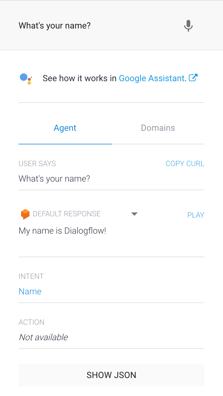 Geben Sie im Dialogflow-Simulator "What's your name?" ein und drücken Sie die Eingabetaste, um den neuen Intent Name zu testen.