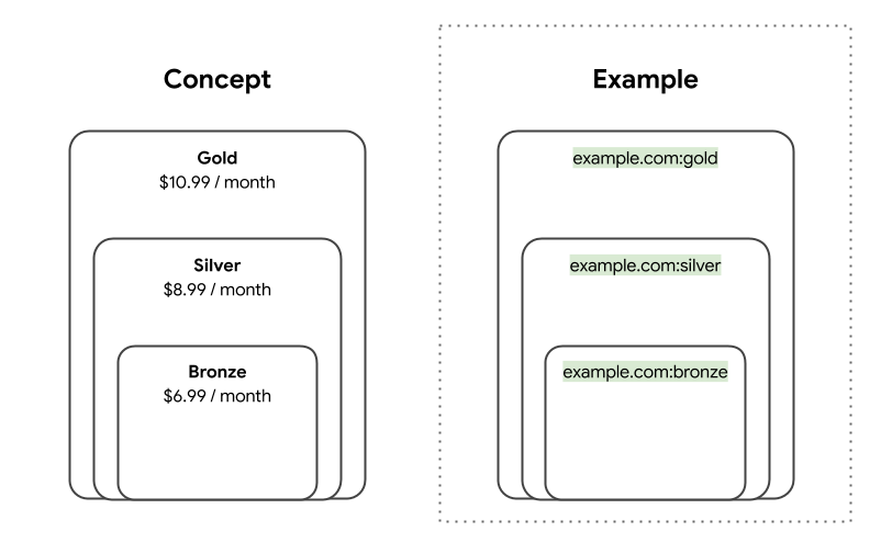 En el siguiente ejemplo de código, el proveedor ofrece tres paquetes en los que parte del contenido se cruza en todos ellos. En este caso, se requiere un cuarto paquete que represente el nivel común. Debe incluir todo el contenido disponible en los tres paquetes.