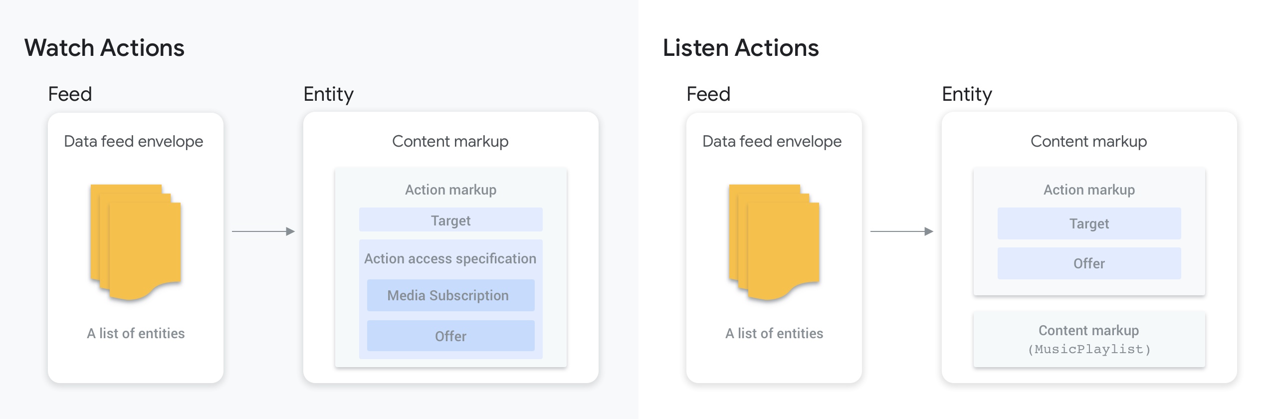 Veri feed'i zarf, Media Actions feed'indeki en üst düzey nesnedir. Nesne, kataloğunuzdaki tüm içeriği temsil eden bir dizi içerik işaretleme nesnesi (varlık) içerir.