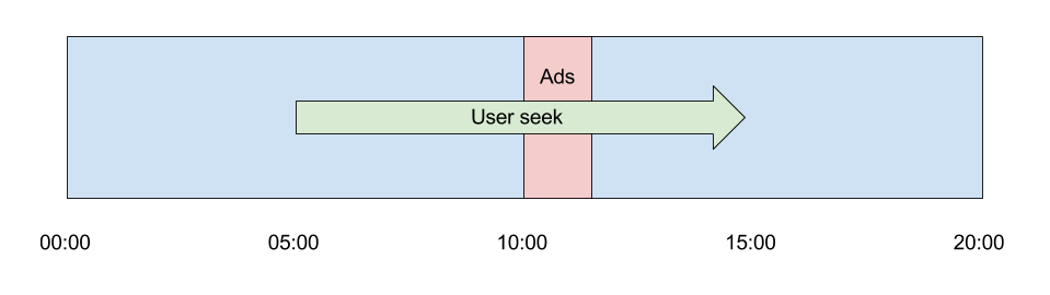 Przykład znajdziesz na diagramie poniżej. Widz ogląda film i postanawia przewinąć go z 5 minuty do 15 minuty. W 10 minucie filmu znajduje się jednak przerwa na reklamę, którą chcesz wyświetlić użytkownikom przed odtworzeniem dalszej części filmu:
