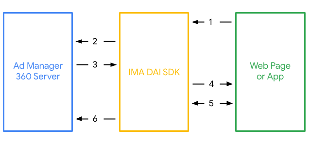 Diagram berikut menggambarkan dan memberi anotasi pada interaksi antara pemutar video Anda, IMA DAI SDK, dan Ad Manager 360.