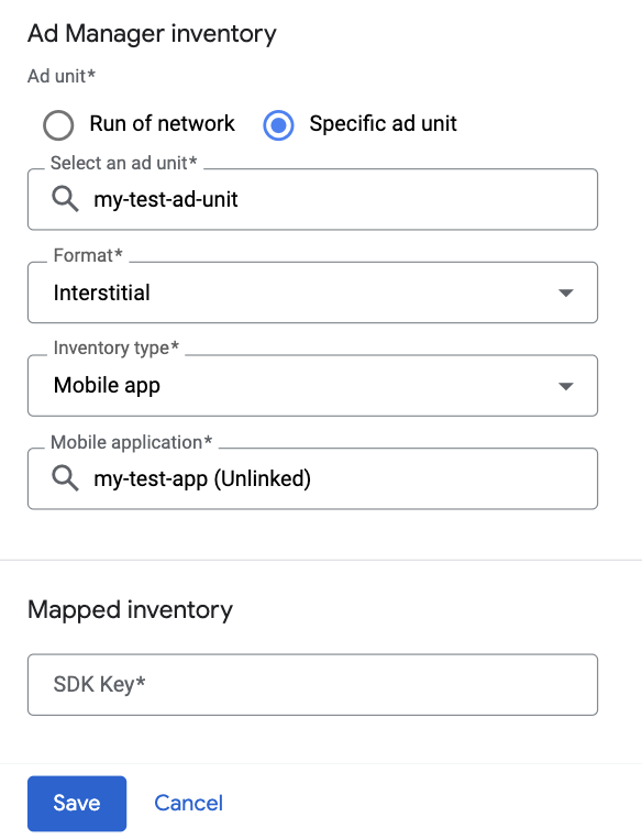 選擇「特定廣告單元」。選取廣告單元和格式,並將「廣告空間類型」設為「行動應用程式」。接著選取「行動應用程式」,然後輸入在上一個部分取得的「SDK 金鑰」。最後按一下「儲存」。