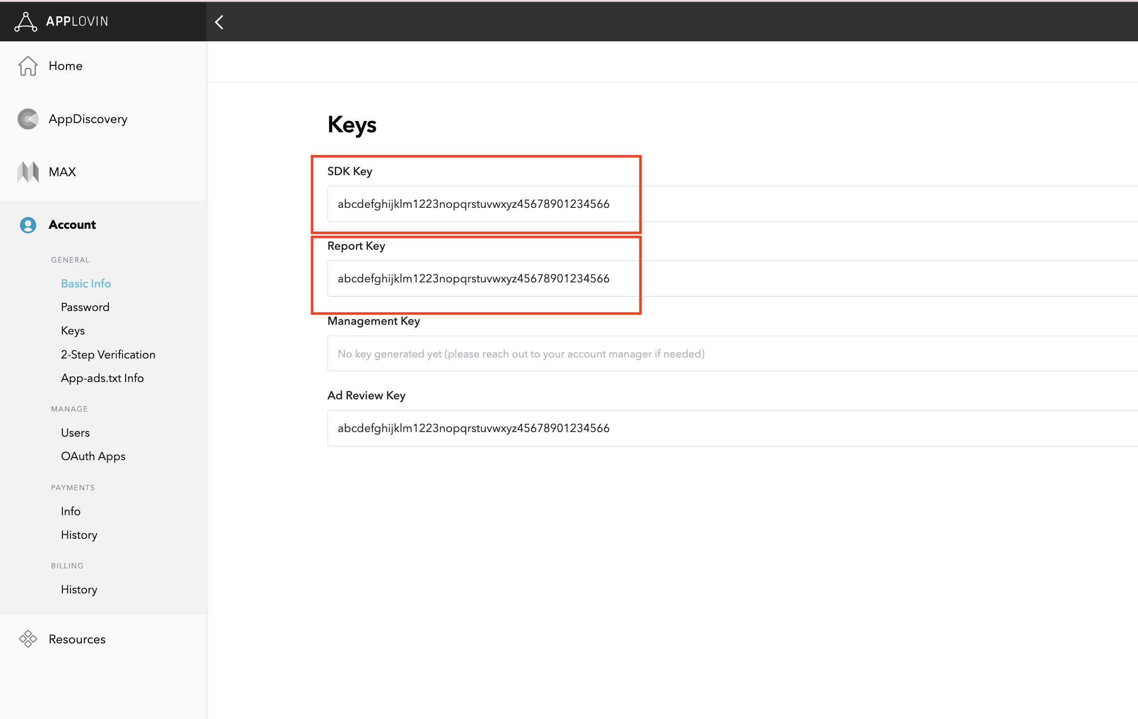 アド マネージャーの広告ユニットを設定するには、AppLovin の SDK キーとレポートキーが必要です。これらの値を確認するには、AppLovin UI > [Account] > [Keys] に移動します。