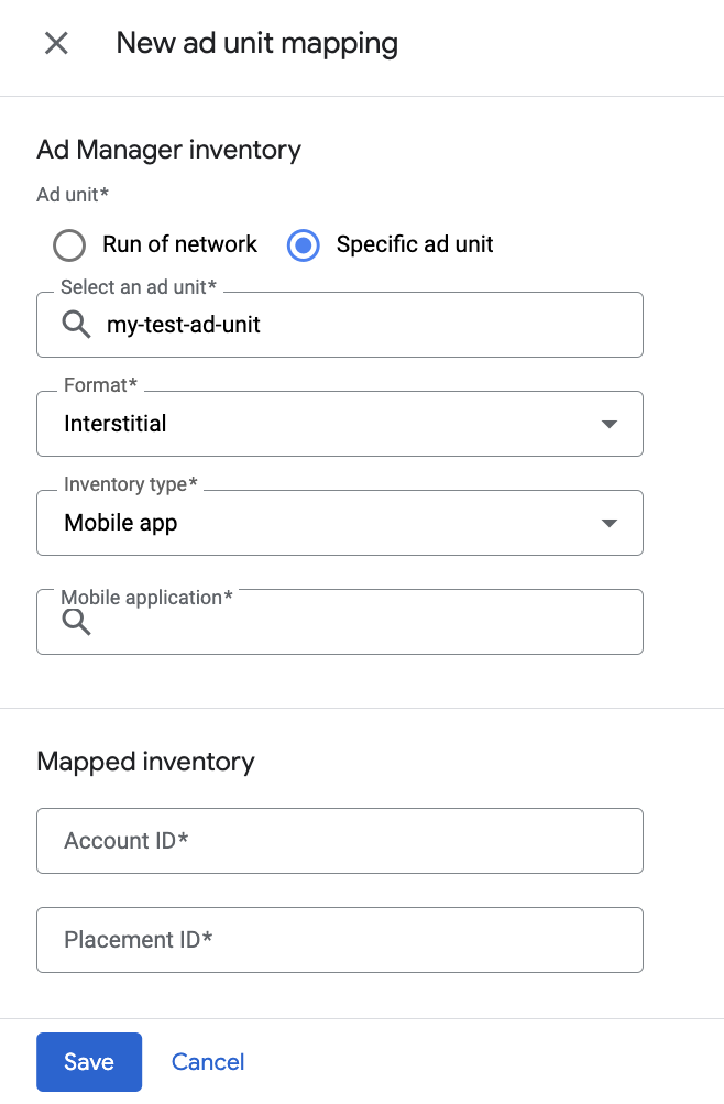 특정 광고 단위를 선택합니다. 광고 단위와 형식, 인벤토리 유형으로는 모바일 앱을, 그리고 모바일 애플리케이션을 선택합니다. 그런 다음 이전 섹션에서 얻은 계정 ID와 게재위치 ID를 입력합니다. 마지막으로 저장을 클릭합니다.