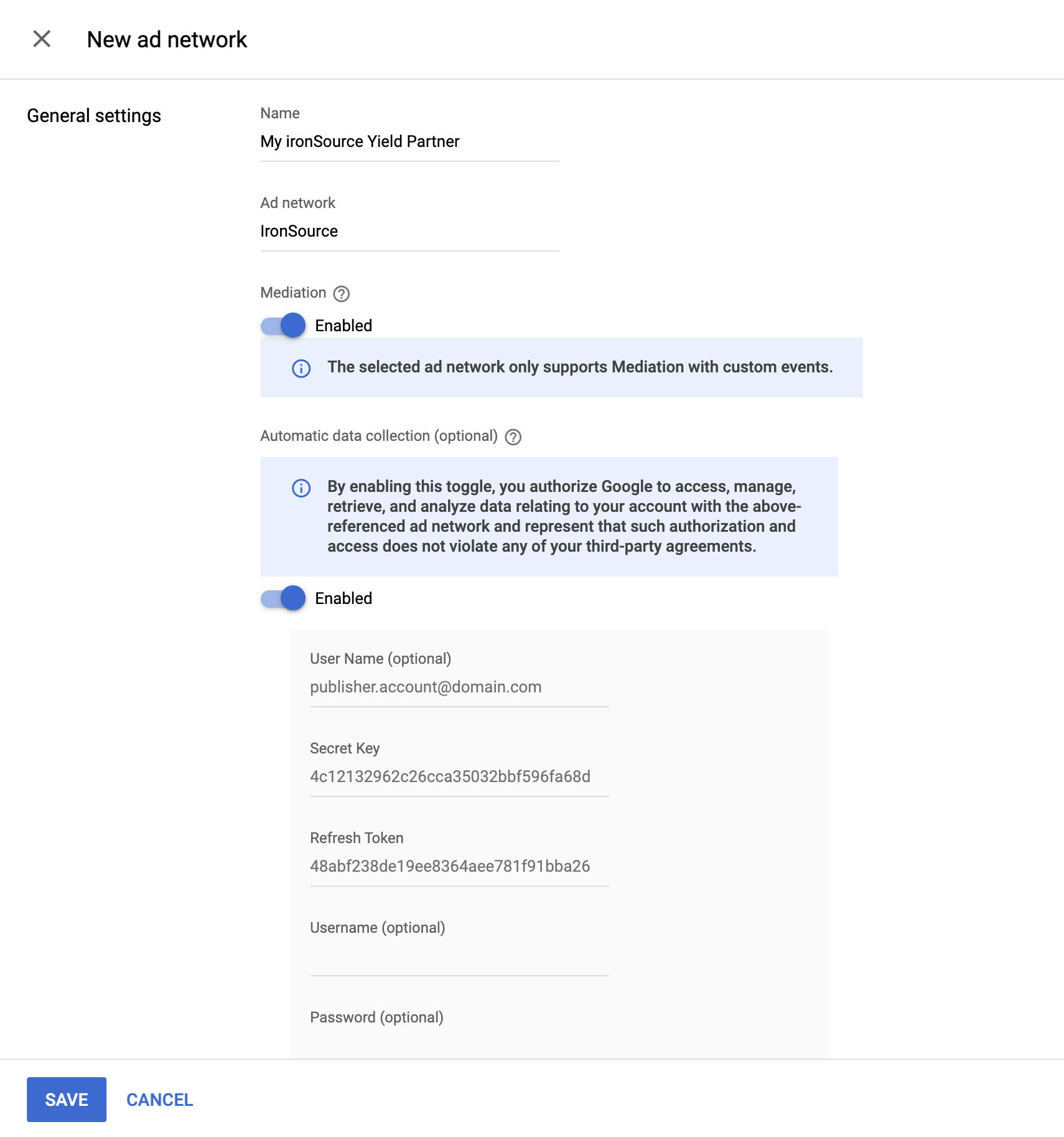 광고 네트워크로 ironSource Ads를 선택하고 고유한 이름을 입력한 후 미디에이션을 사용 설정합니다.