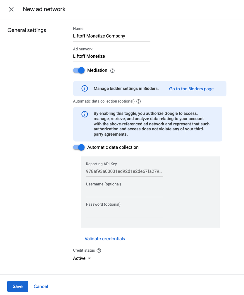 Seleziona Liftoff Monetize come Rete pubblicitaria, inserisci un Nome univoco e attiva la Mediazione. Attiva Raccolta automatica dei dati e inserisci la chiave API Reporting ottenuta nella sezione precedente.