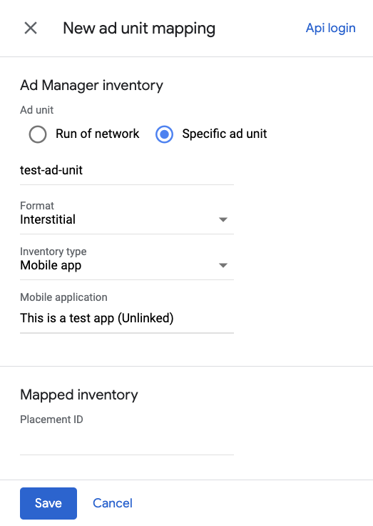 Выберите «Конкретный рекламный блок» . Выберите рекламный блок и формат, тип инвентаря — «Мобильное приложение» , и ваше мобильное приложение . Затем введите идентификатор размещения, полученный в предыдущем разделе.