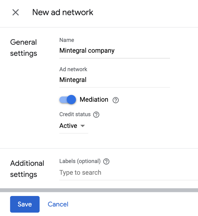 विज्ञापन नेटवर्क के तौर पर Mintegral को चुनें. इसके बाद, कोई यूनीक नाम डालें और मीडिएशन चालू करें.