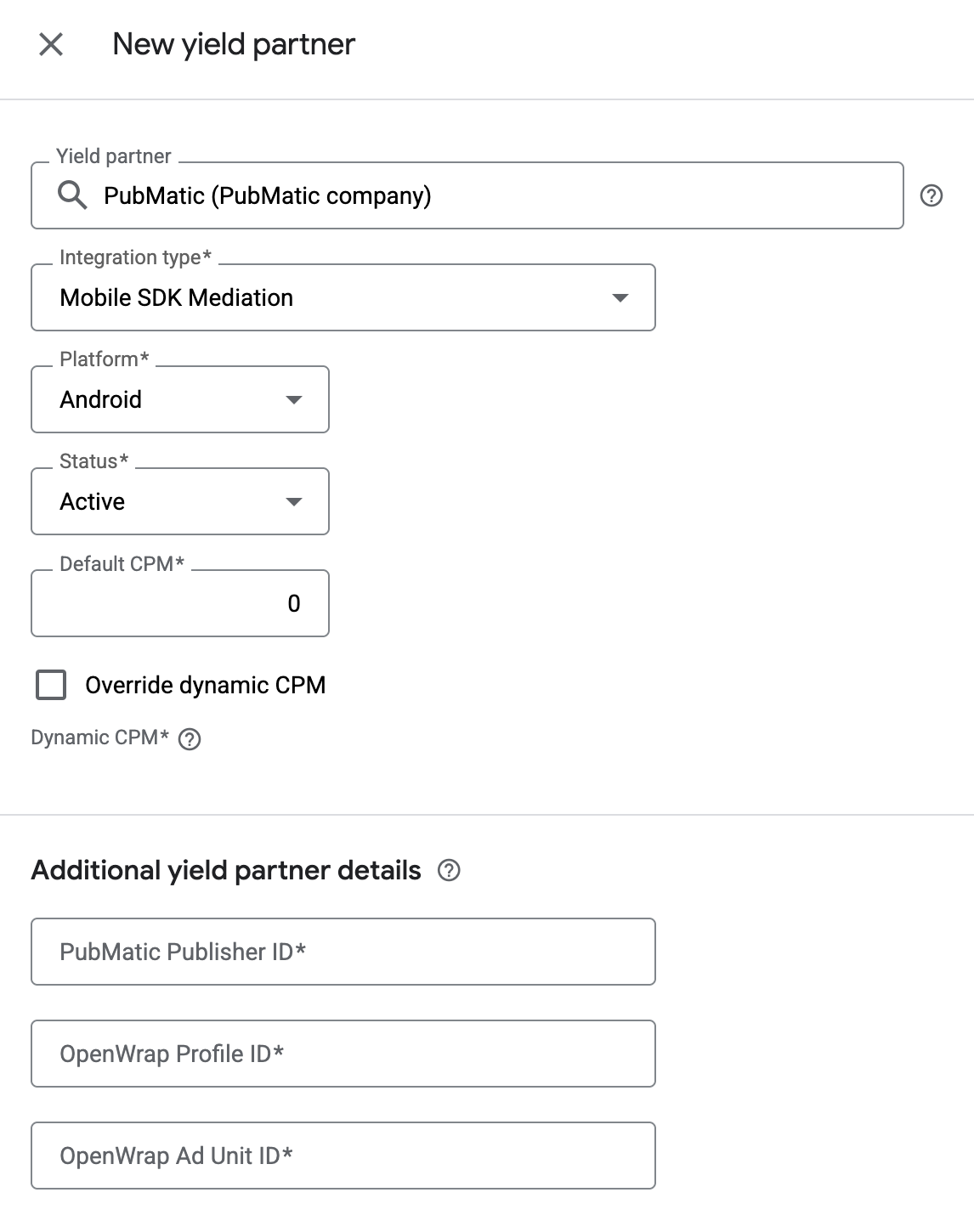 पिछले सेक्शन में, PubMatic OpenWrap SDK के लिए बनाई गई कंपनी चुनें. इंटिग्रेशन टाइप के तौर पर मोबाइल SDK मीडिएशन, प्लैटफ़ॉर्म के तौर पर Android, और स्टेटस के तौर पर चालू है को चुनें.
