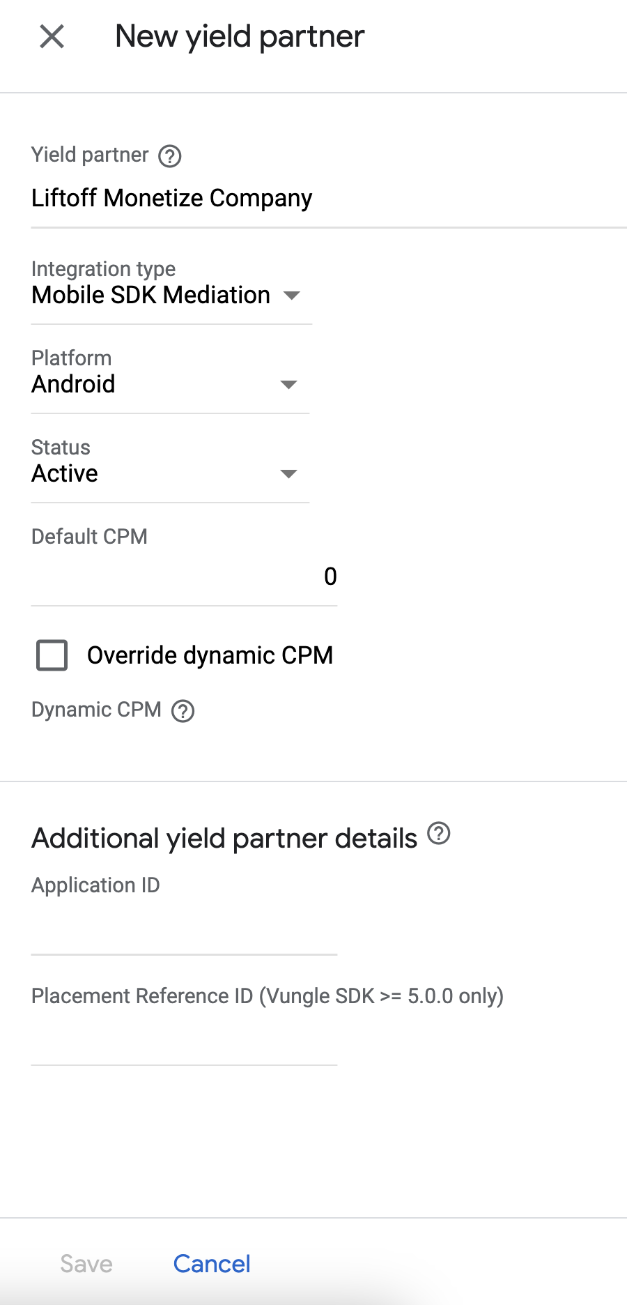 选择您在上一部分中为 Liftoff Monetize 创建的公司。 选择移动 SDK 中介作为集成类型,Android 作为平台,有效作为状态。