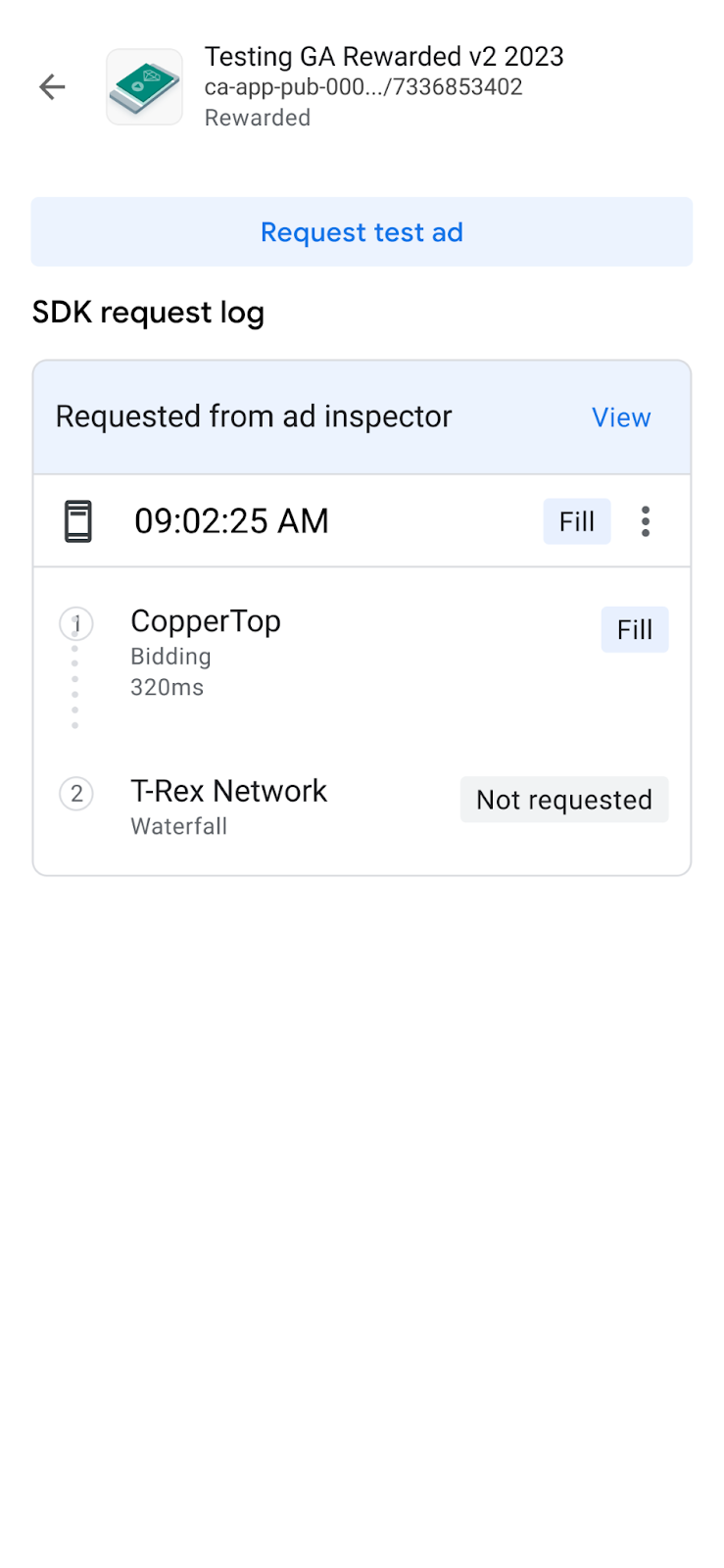 3. एसडीके टूल के लिए किए गए अनुरोध के लॉग में जाकर, टेस्ट के लिए अनुरोध किए गए विज्ञापन के बारे में जानकारी देखें.