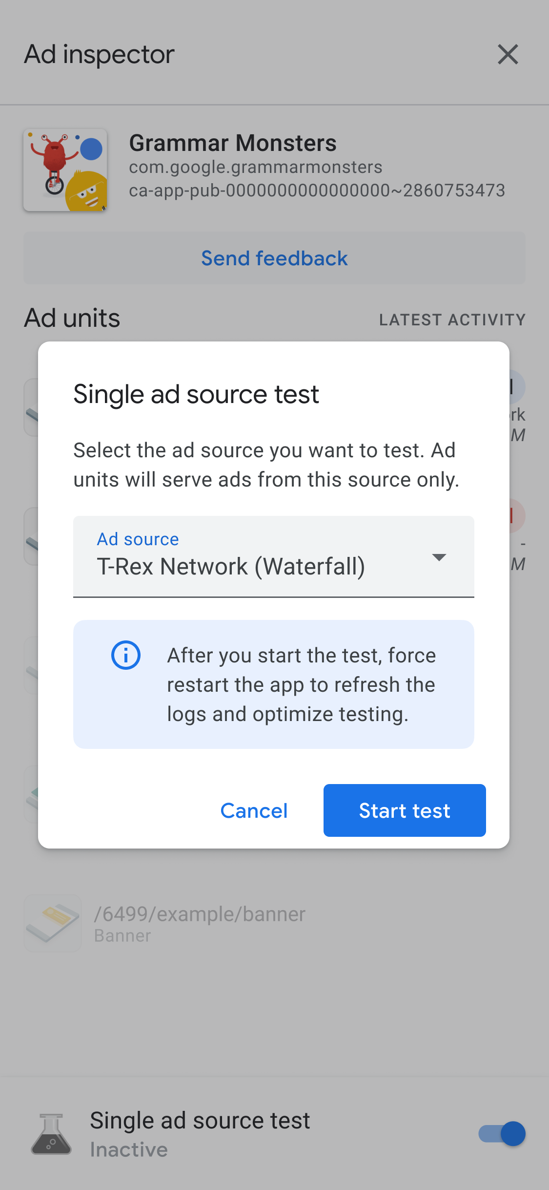 A configuração de teste com uma única origem de anúncios se aplica a todas as solicitações futuras. Esse teste não considera os anúncios que já foram armazenados em cache durante a sessão. Recomendamos que você force a reinicialização do app ao aplicar um teste com uma única origem de anúncios. Essa abordagem invalida os anúncios armazenados em cache que poderiam ser exibidos no lugar da origem de anúncios escolhida receber uma solicitação.