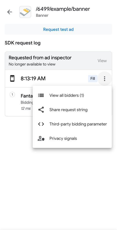 SDK 请求日志中,您可以看到广告请求中调用的出价广告来源。 如需查看出价竞价中每个广告来源的详细信息,请点按 more_vert ,然后点击查看所有出价方