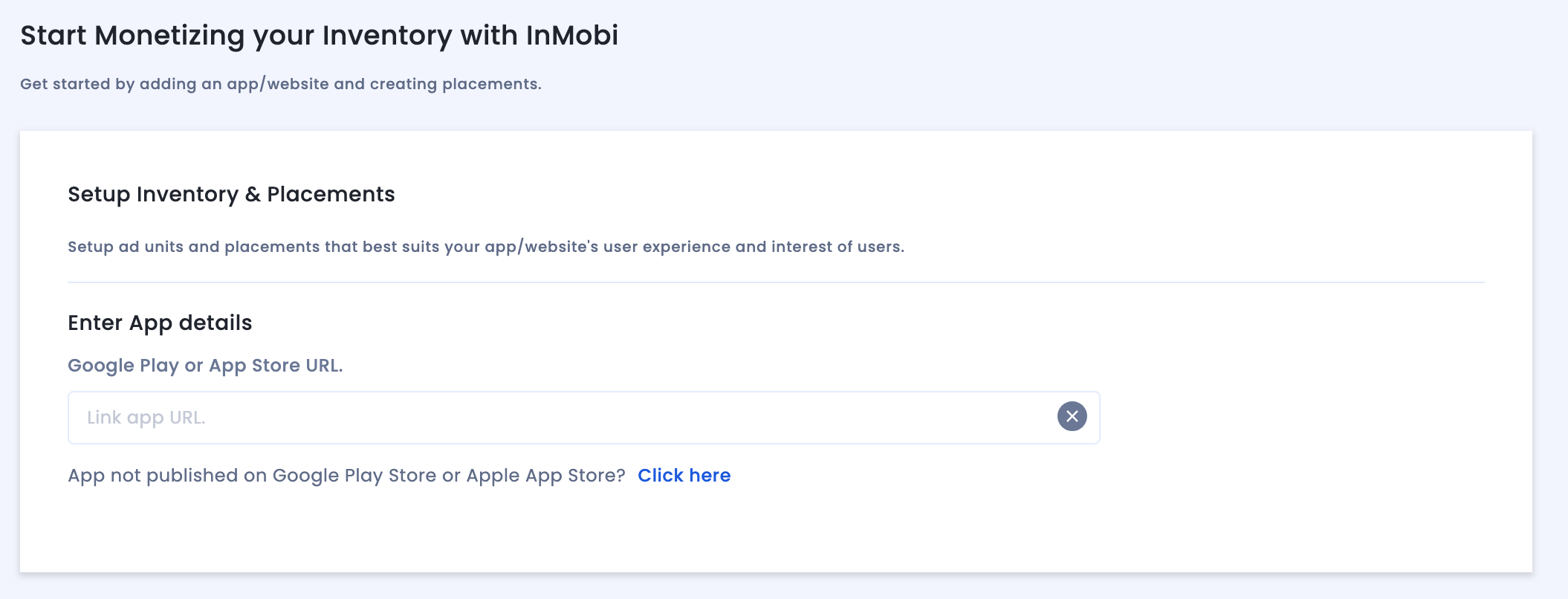 Para adicionar seu app ao painel do InMobi, clique em Inventário > Configurações de inventário.