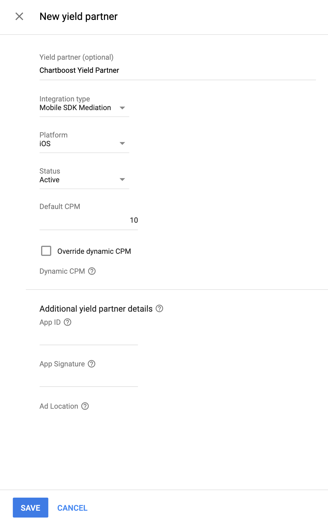 [収益パートナー] を選択したら、[統合タイプ] で [モバイル SDK メディエーション]、[プラットフォーム] で [iOS]、[ステータス] で [有効] を選択します。前のセクションで取得したアプリ ID、アプリ署名、広告の場所を入力します。次に、[デフォルト CPM] の値を入力します。