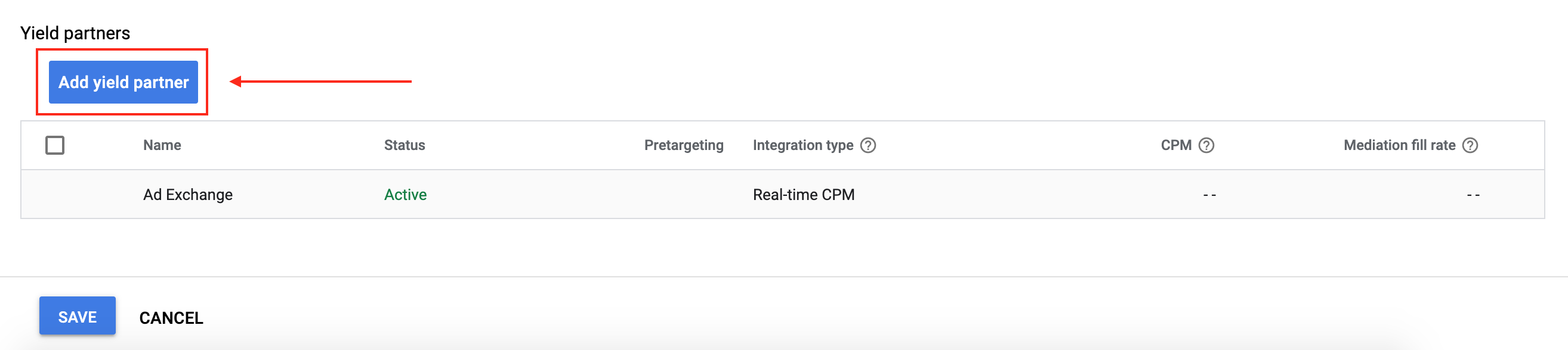 Una vez que se selecciona el Socio de rendimiento, elige Mediación del SDK para dispositivos móviles como el Tipo de integración, iOS como la Plataforma y Activo como el Estado. Ingresa el ID de publicador, el ID de medio y el ID de posición que obtuviste en la sección anterior. Luego, ingresa un valor de CPM predeterminado.