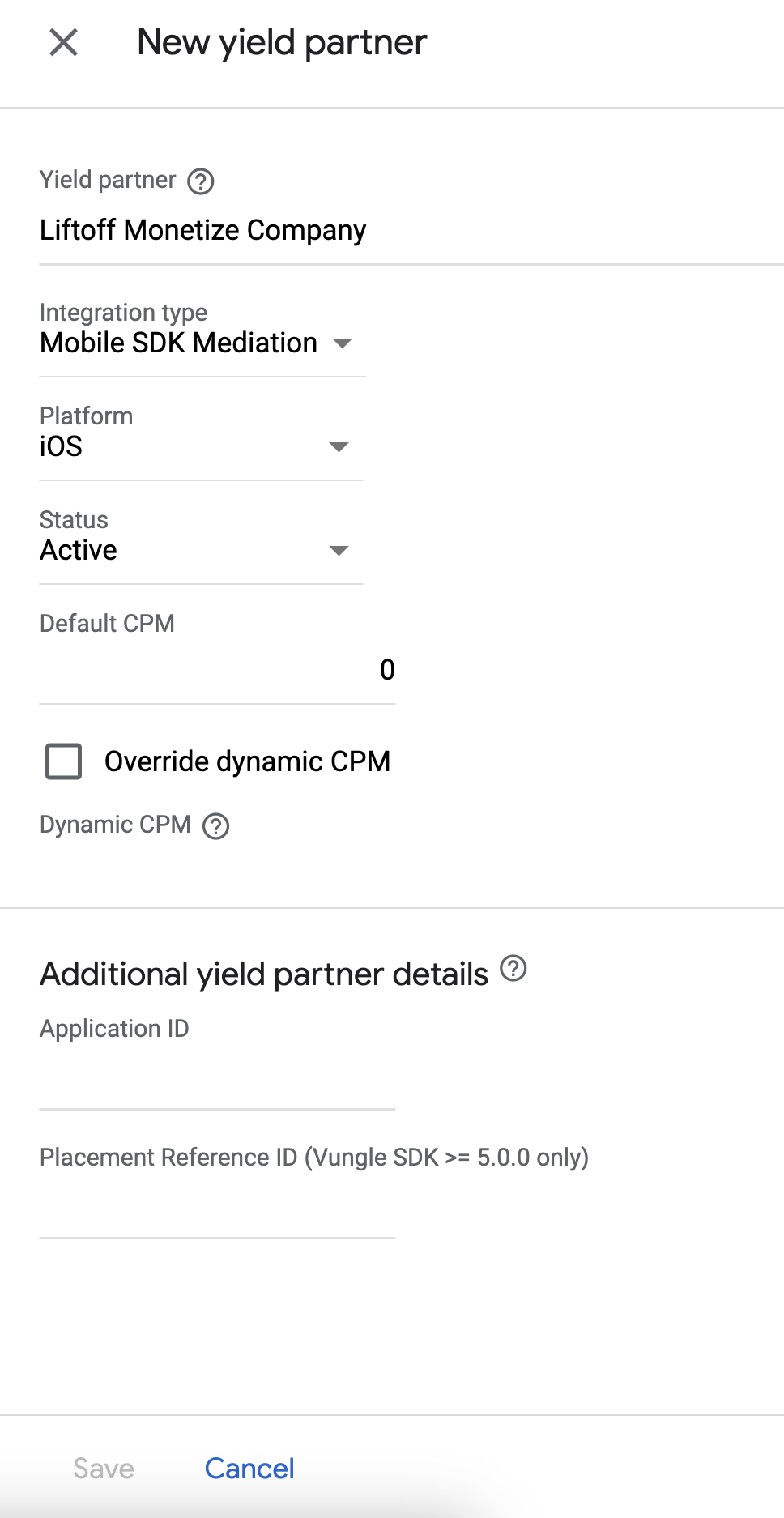 이전 섹션에서 얻은 애플리케이션 ID게재위치 참조 ID, 기본 CPM 값을 입력합니다. 저장을 클릭합니다.