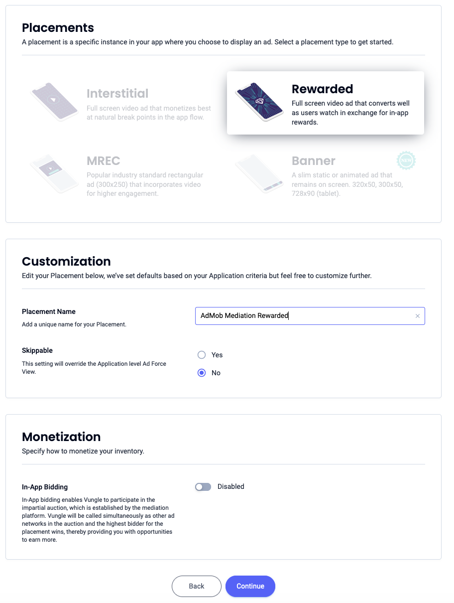 इनाम वाला चुनें. प्लेसमेंट का नाम डालें, स्किप किए जा सकने वाले विकल्प को चालू करें, और बाकी का फ़ॉर्म भरें. [सिर्फ़ बिडिंग के लिए] कमाई करना में जाकर, इन-ऐप्लिकेशन बिडिंग स्विच को टॉगल करके चालू है पर सेट करें. प्लेसमेंट बनाने के लिए, पेज पर सबसे नीचे मौजूद जारी रखें बटन पर क्लिक करें.