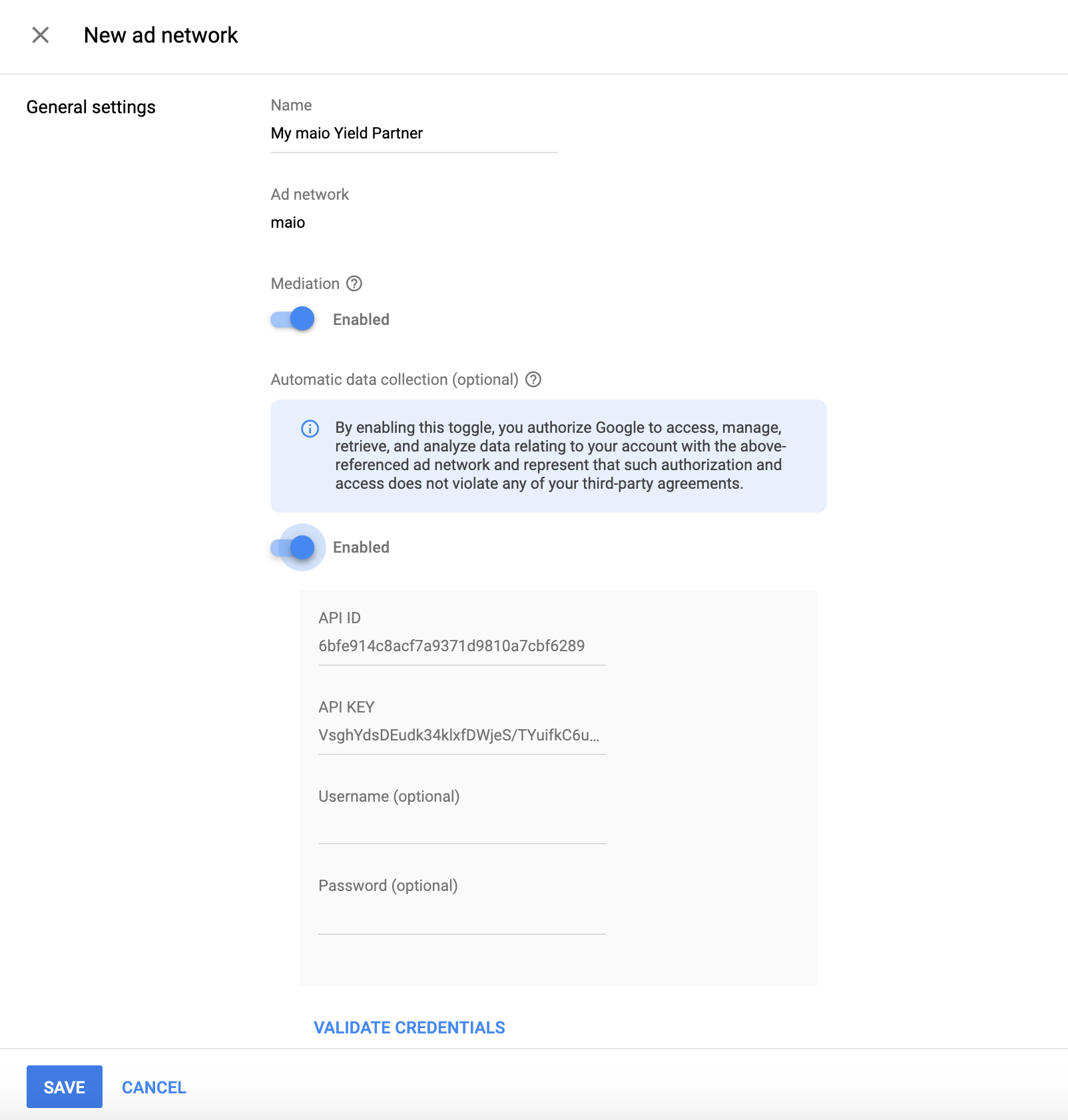 选择 maio 作为广告联盟,输入唯一的名称,然后启用中介。