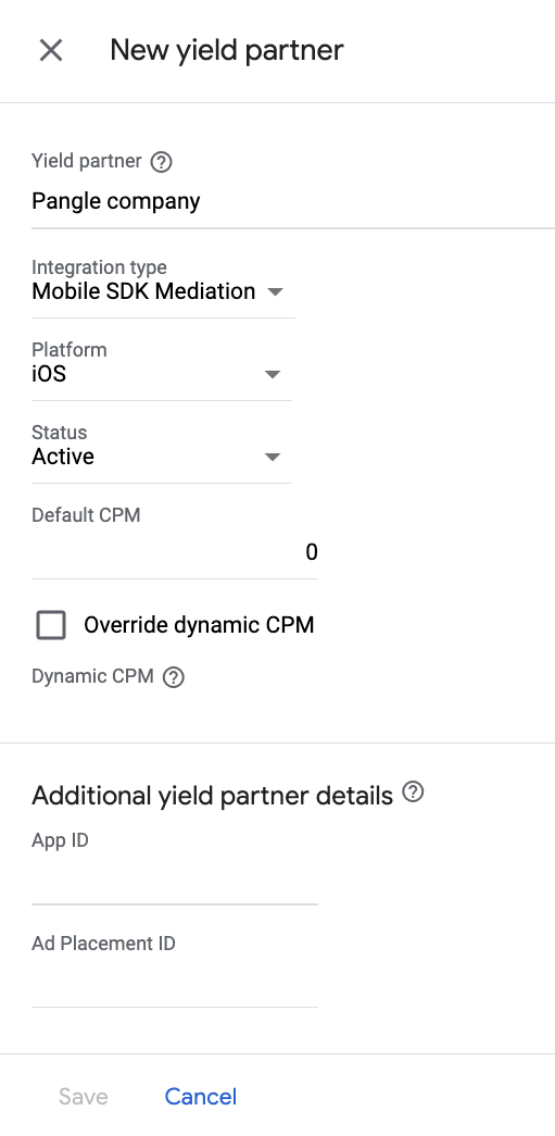 Insira o ID do app e o ID da posição do anúncio obtidos na seção anterior, além do valor do CPM padrão. Clique em Salvar.