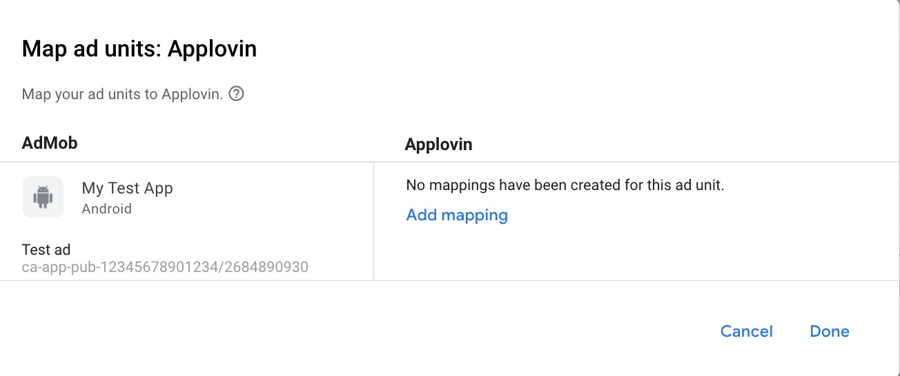 Jeśli masz już mapowanie dla AppLovin, możesz je wybrać. W przeciwnym razie kliknij Dodaj mapowanie.