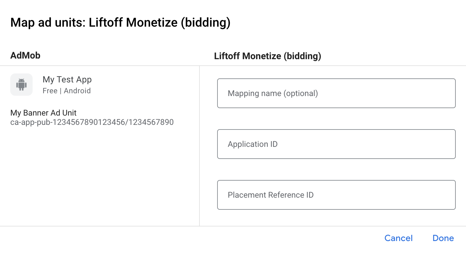 Wenn Sie bereits eine Zuordnung für Liftoff Monetize haben, können Sie sie auswählen. Klicken Sie andernfalls auf Zuordnung hinzufügen.