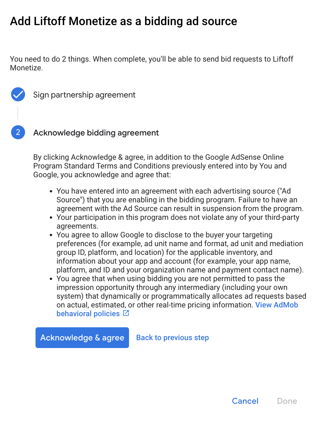 पार्टनरशिप के कानूनी समझौते पर हस्ताक्षर करने का तरीका पर क्लिक करें और Liftoff Monetize के साथ बिडिंग पार्टनरशिप सेट अप करें.