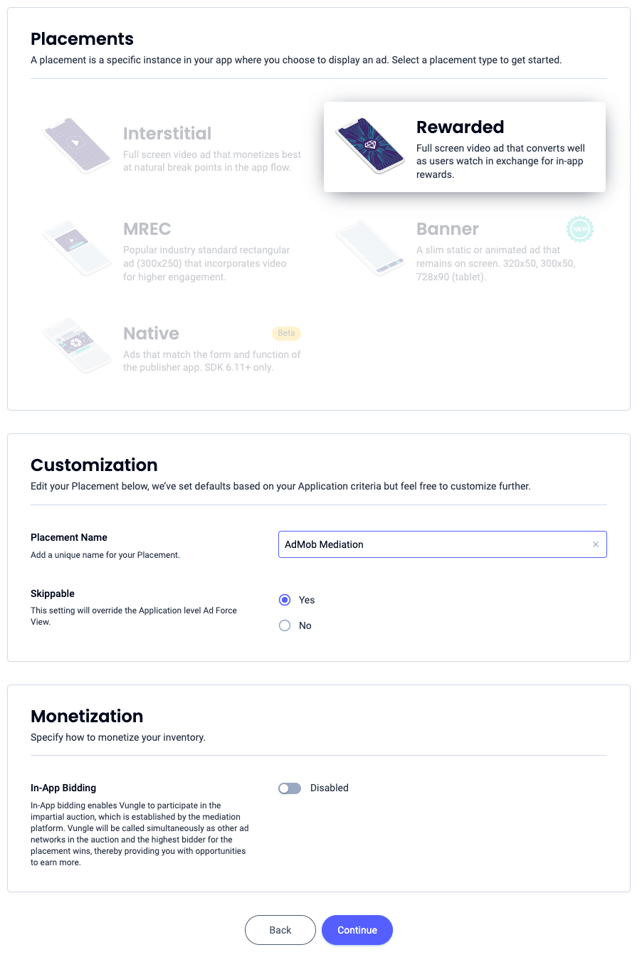 选择奖励。输入展示位置名称,启用可跳过,然后填写表单的其余部分。[仅限出价] 在创收下,将应用内出价开关切换为已启用。点击页面底部的继续按钮,以创建展示位置。