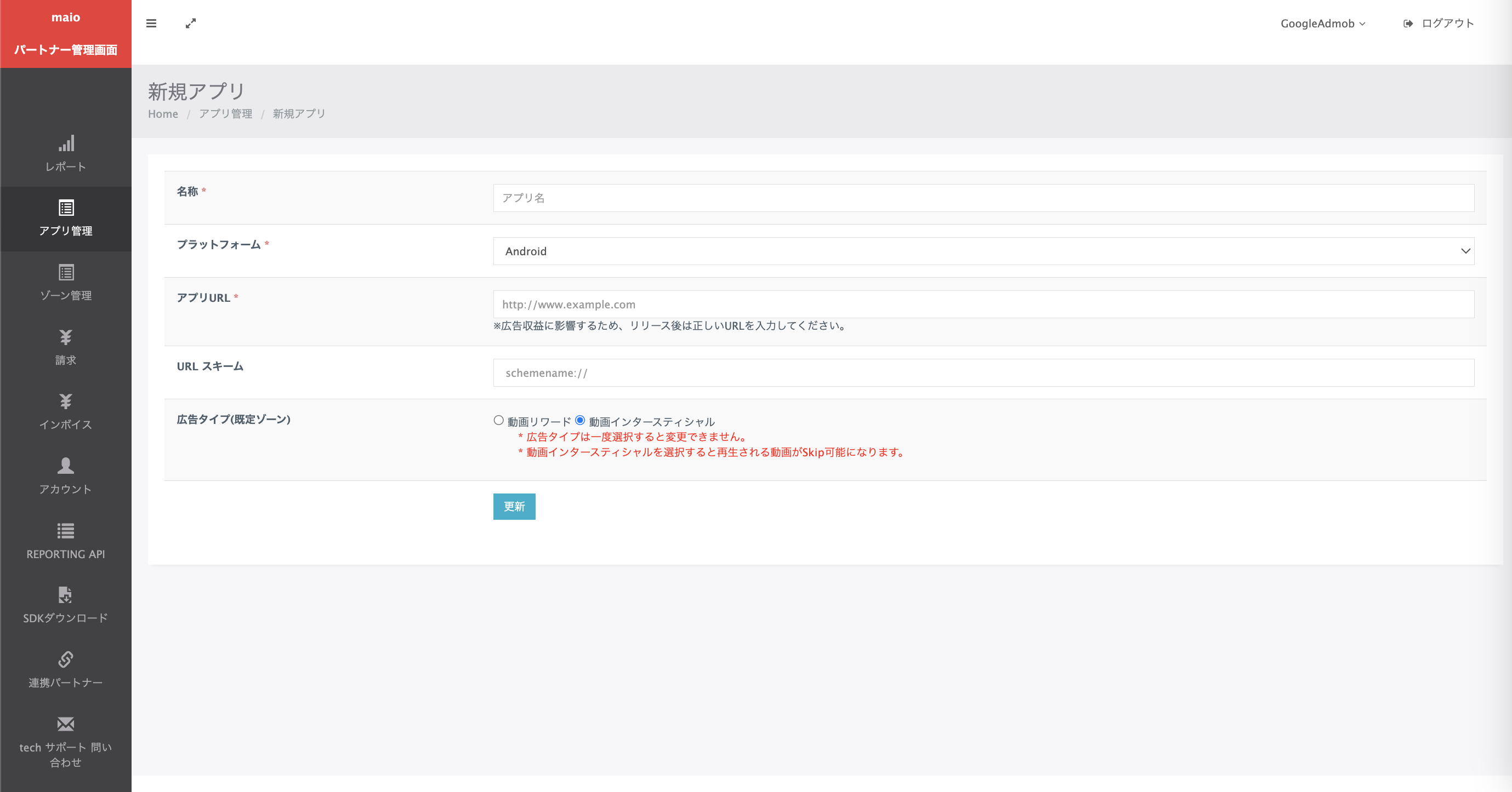 ป้อนชื่อแอป เลือกแพลตฟอร์ม และระบุURL ของแอป เลือกโฆษณาวิดีโอคั่นระหว่างหน้าเป็นประเภทโฆษณา แล้ว คลิกอัปเดต