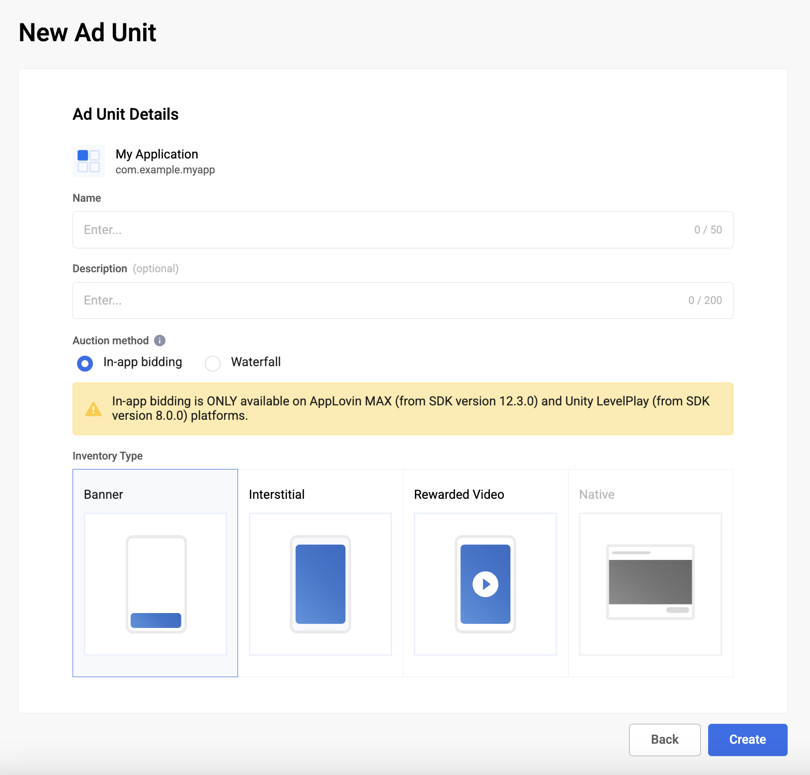 입찰 방법으로 인앱 입찰을 선택하고 양식의 나머지 부분을 작성합니다. 그런 다음 만들기를 클릭합니다.