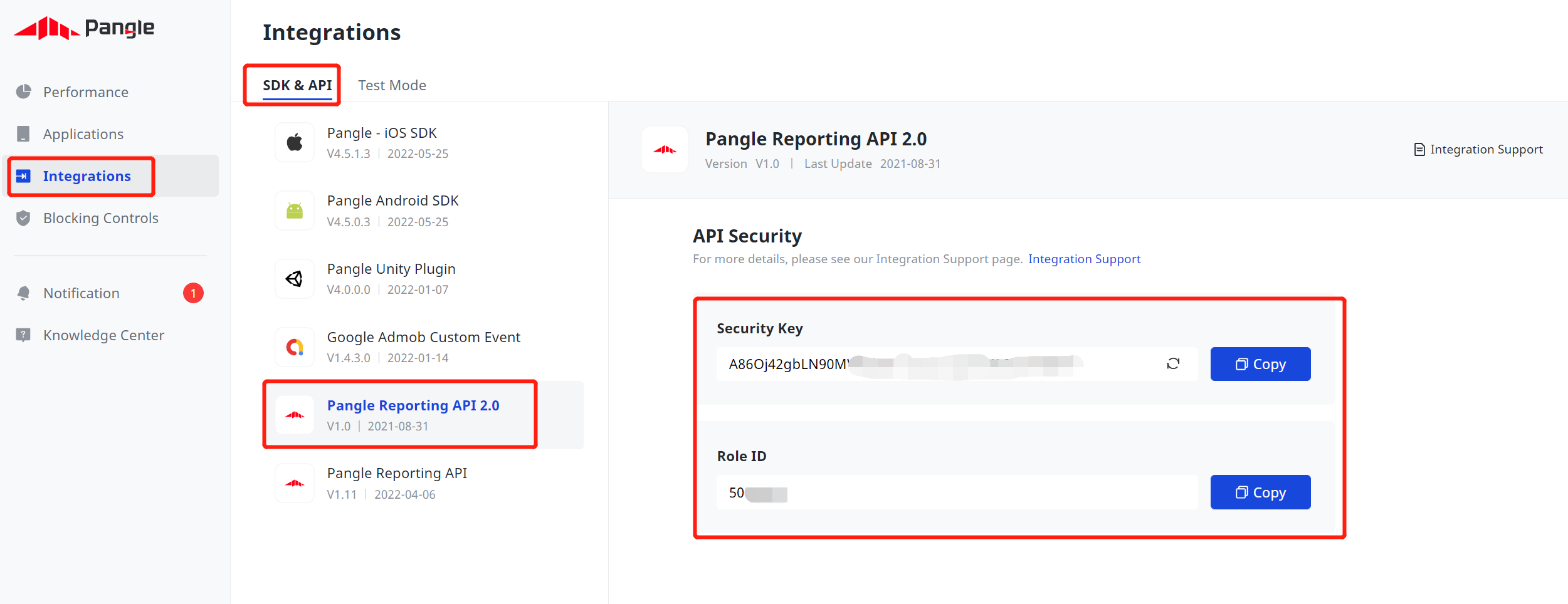 इंटिग्रेशन > SDK टूल और एपीआई > Pangle Reporting API 2.0 पर क्लिक करें. भूमिका का आईडी और सुरक्षा कुंजी नोट करें.