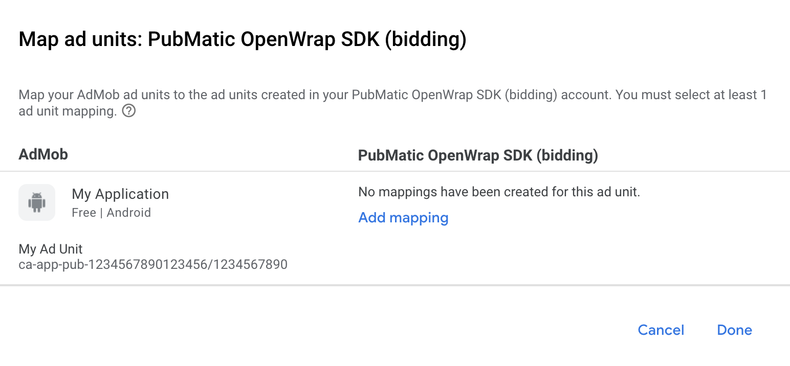 Se hai già una mappatura per l'SDK PubMatic OpenWrap, puoi selezionarla. In caso contrario, fai clic su Aggiungi mappatura.