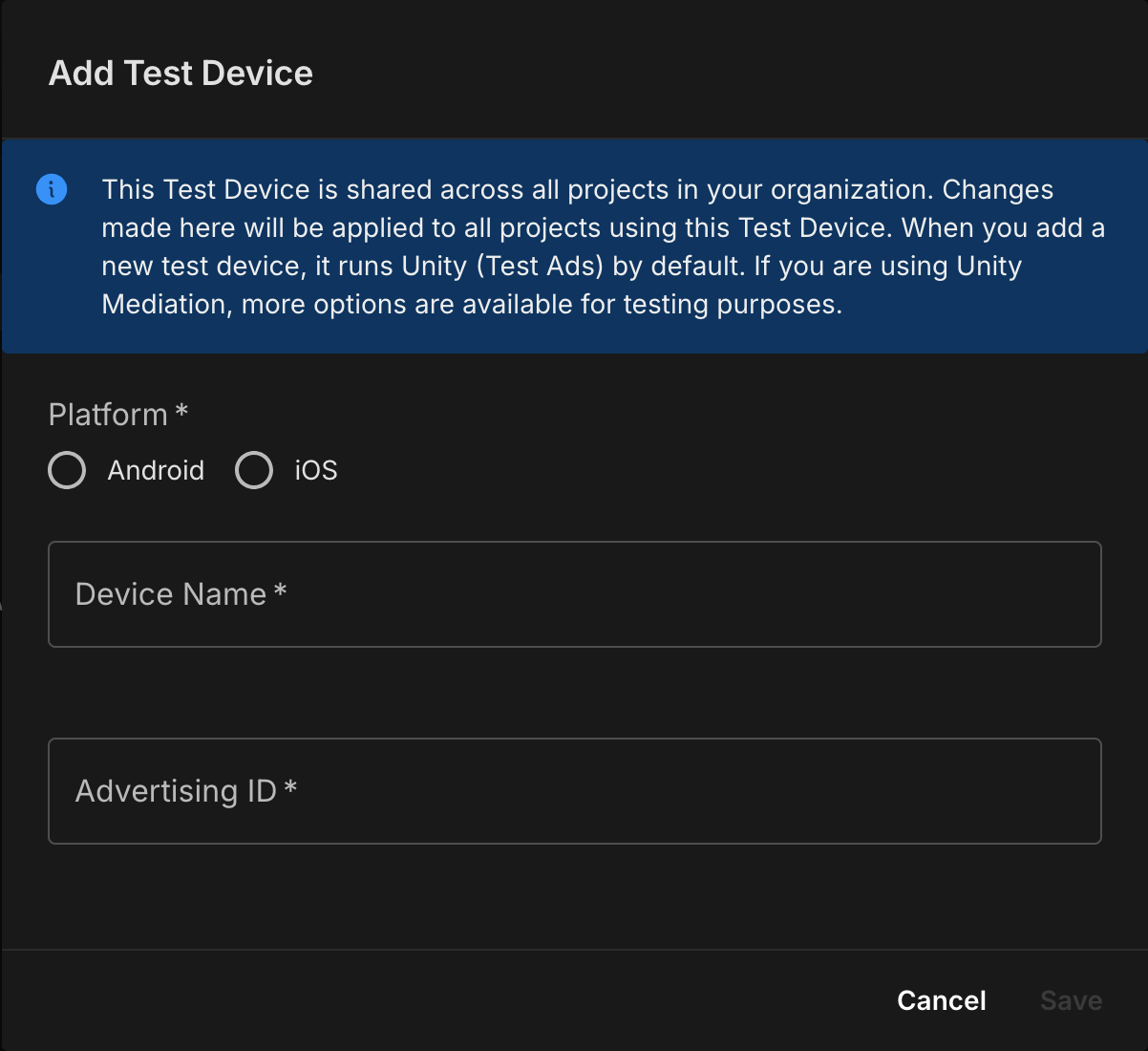 您可以在 Unity Ads 信息中心内启用测试模式。依次前往 Unity Ads 创收 > 测试。