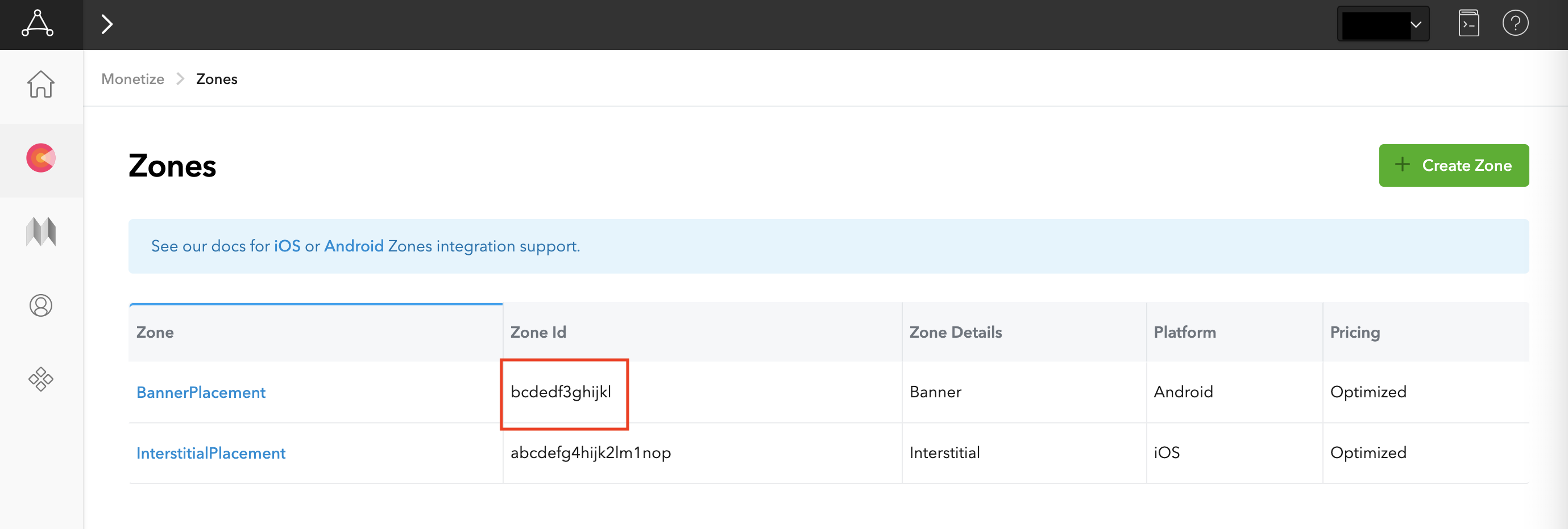 在 AppLovin 使用者介面中,選取「Monetization」(營利) 部分下方的「Zones」(區域),即可查看已註冊的區域 ID。如果您已為應用程式建立必要區域,請跳到步驟 2。 如要建立新的區域 ID,請按一下「建立區域」。