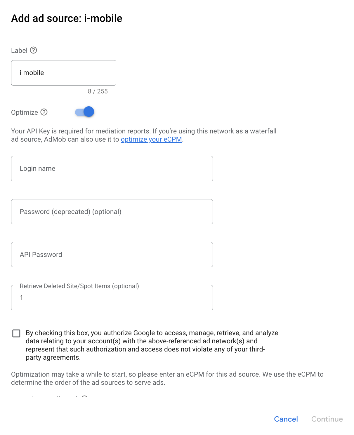 i-mobile'ı seçin ve Optimize anahtarını etkinleştirin. i-mobile için reklam kaynağı optimizasyonunu ayarlamak üzere önceki bölümde alınan Giriş adı ve API şifresini girin. Ardından i-mobile için bir eBGBM değeri girin ve Devam'ı tıklayın.