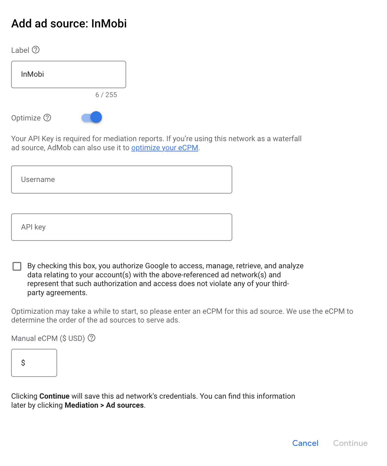 選取「InMobi」,然後啟用「最佳化」切換按鈕。輸入上一節取得的「使用者名稱」和「API 金鑰」,進行 InMobi 廣告來源的最佳化設定,然後輸入 InMobi 的有效千次曝光出價金額,並點按「繼續」。