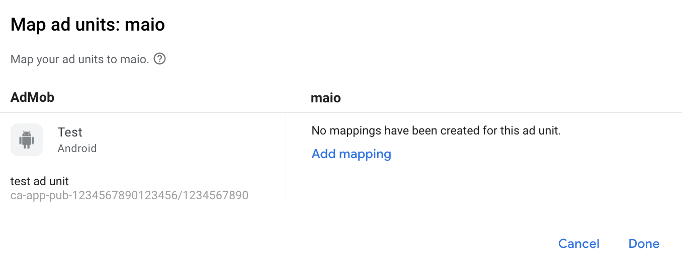 本指南說明如何使用 GMA Next-Gen SDK,透過 AdMob 中介服務載入及顯示 maio 廣告,也會介紹刊登序列整合作業,內容涵蓋如何將 maio 加到廣告單元的中介服務設定,以及如何將 maio SDK 和轉接程式整合至 Android 應用程式。