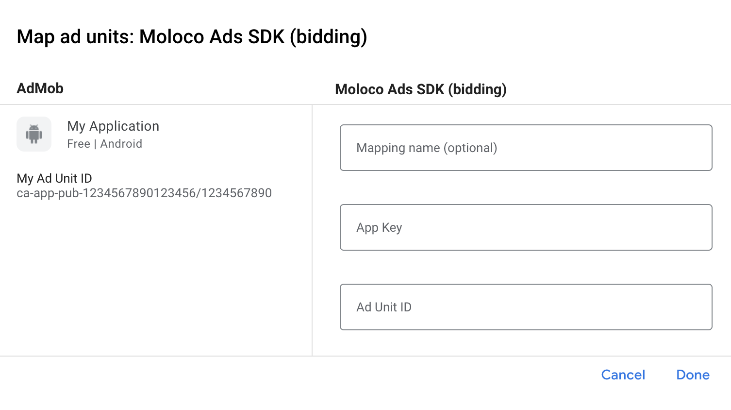 다음으로, 앱 키 와 광고 단위 ID 를 이전 섹션에서 얻은 대로 입력합니다. 그런 다음 완료 를 클릭합니다.
