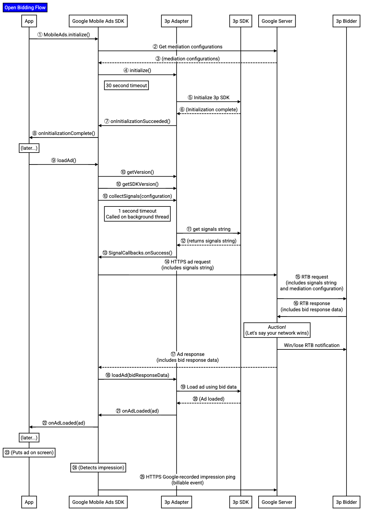 • Steps 10-13: Collect signals from your ad network SDK to be sent to your bidder to participate in an RTB request, and forward them to the Google Mobile Ads SDK.