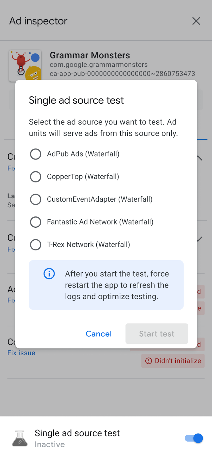 2. Pilih sumber iklan yang akan diuji. Setelah itu, Anda akan menerima halaman Mulai ulang paksa aplikasi: