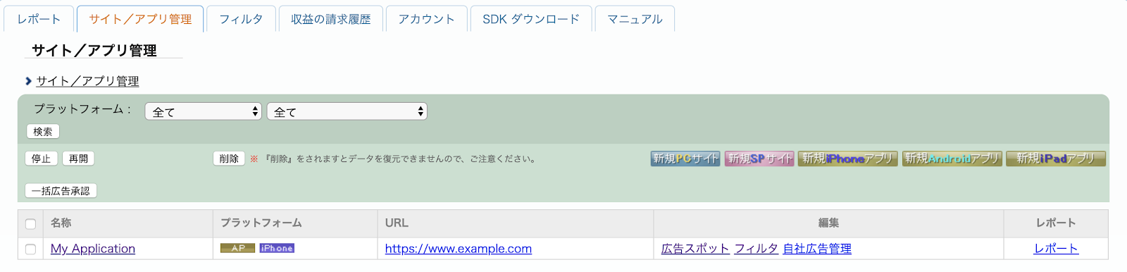Para agregar tu aplicación al panel de i-mobile, haz clic en la pestaña サイト/アプリ管理 (Administración de sitios o aplicaciones) y en el botón de la plataforma de tu aplicación.