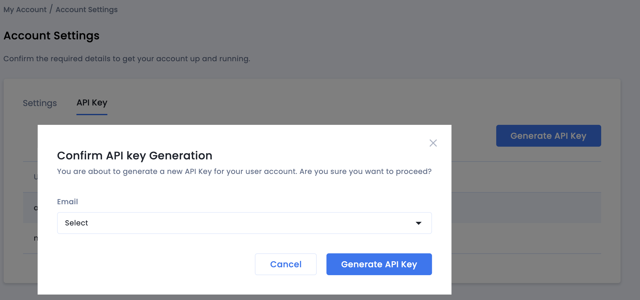 Vai a Account personale > Impostazioni account. Vai alla scheda Chiave API e fai clic su Genera chiave API.