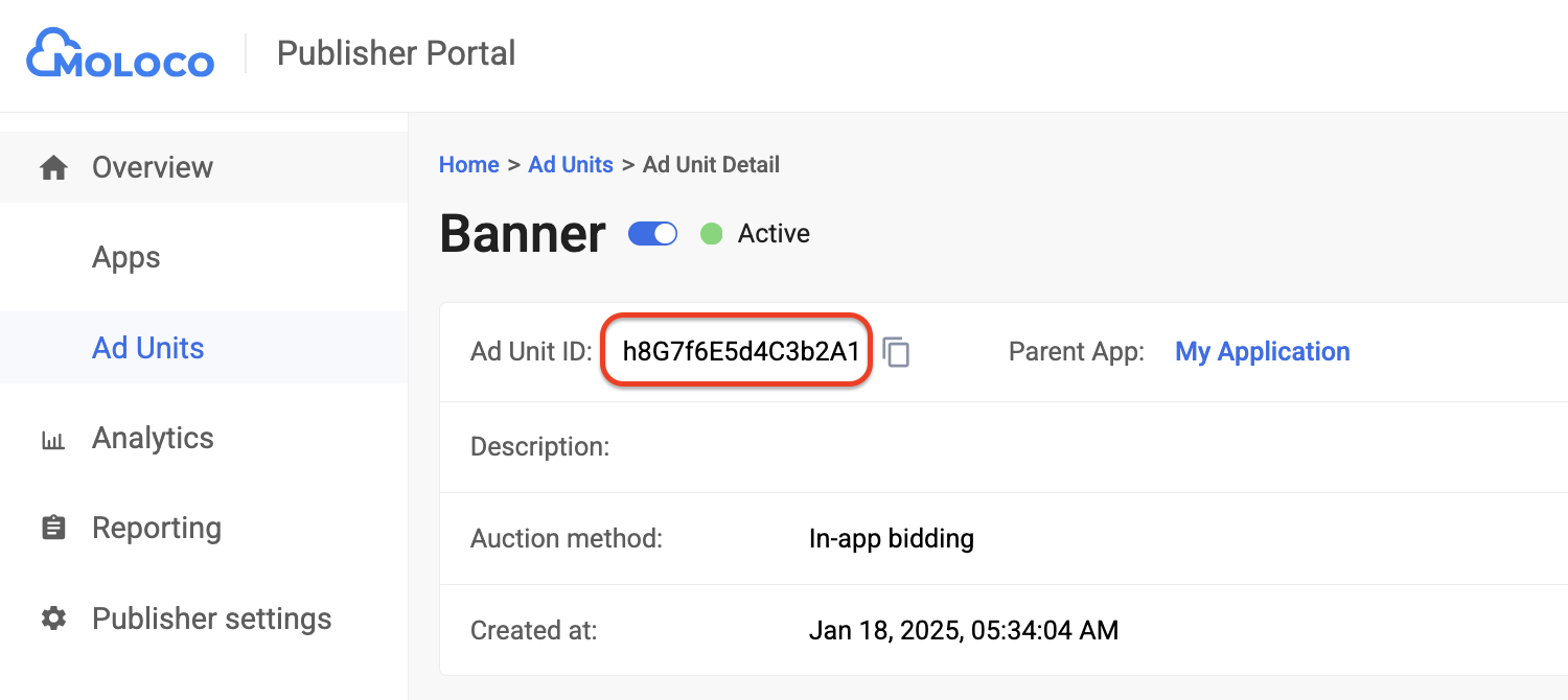 Перейдите во вкладку «Объявления» , чтобы просмотреть подробную информацию о созданном вами рекламном блоке. Запишите идентификатор рекламного блока (Ad Unit ID ).