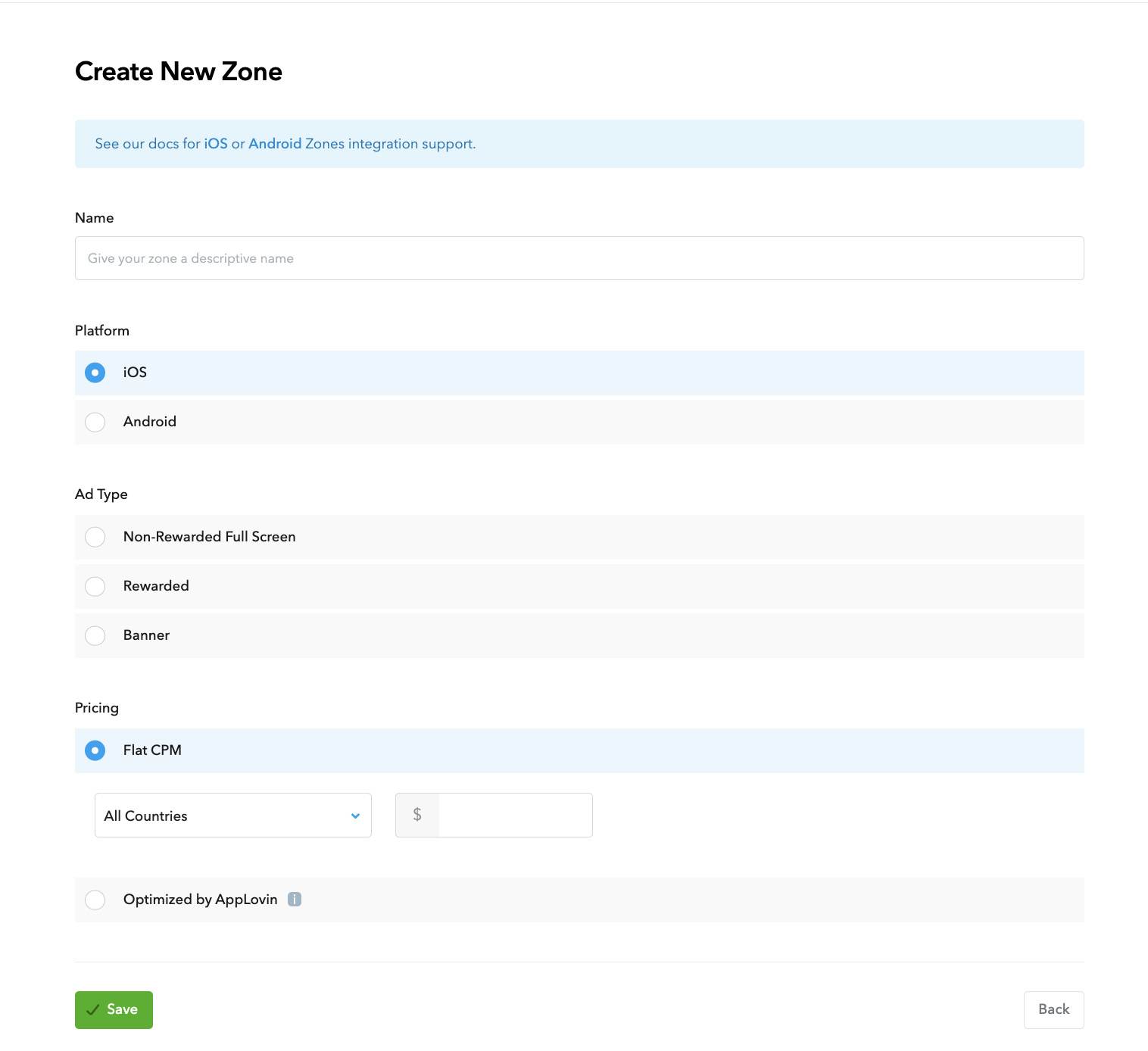 Configure os Preços da zona selecionando CPM fixo ou Otimizado pela AppLovin. Os CPMs podem ser configurados por país para a opção CPM fixo. Em seguida, clique em Salvar.