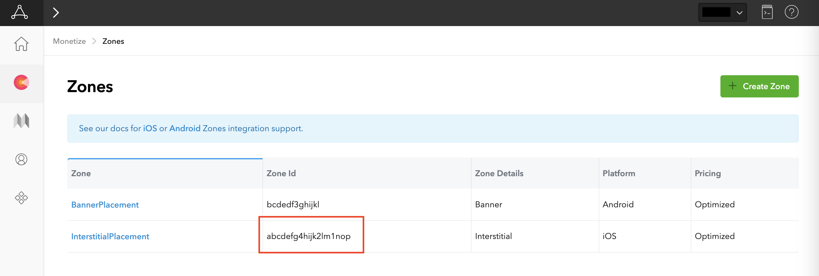 AppLovin の UI で、[Monetization] セクションの [Zones] を選択して、登録済みのゾーン ID にアクセスします。アプリに必要なゾーンをすでに作成している場合は、ステップ 2 に進みます。新しいゾーン ID を作成するには、[ゾーンを作成] をクリックします。