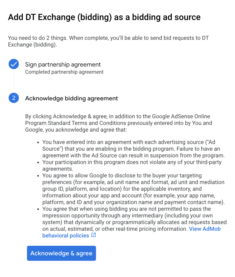 Чтобы добавить DT Exchange (монетизацию Fyber) в список рекламных партнеров, соответствующих европейским и американским государственным нормативным актам, в пользовательском интерфейсе AdMob, выполните действия, описанные в настройках европейских и американских нормативных актов .