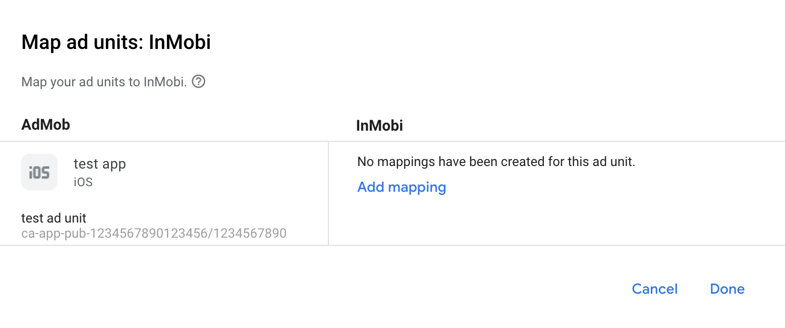 Wenn Sie bereits eine Zuordnung für InMobi haben, können Sie sie auswählen. Klicken Sie andernfalls auf Zuordnung hinzufügen.