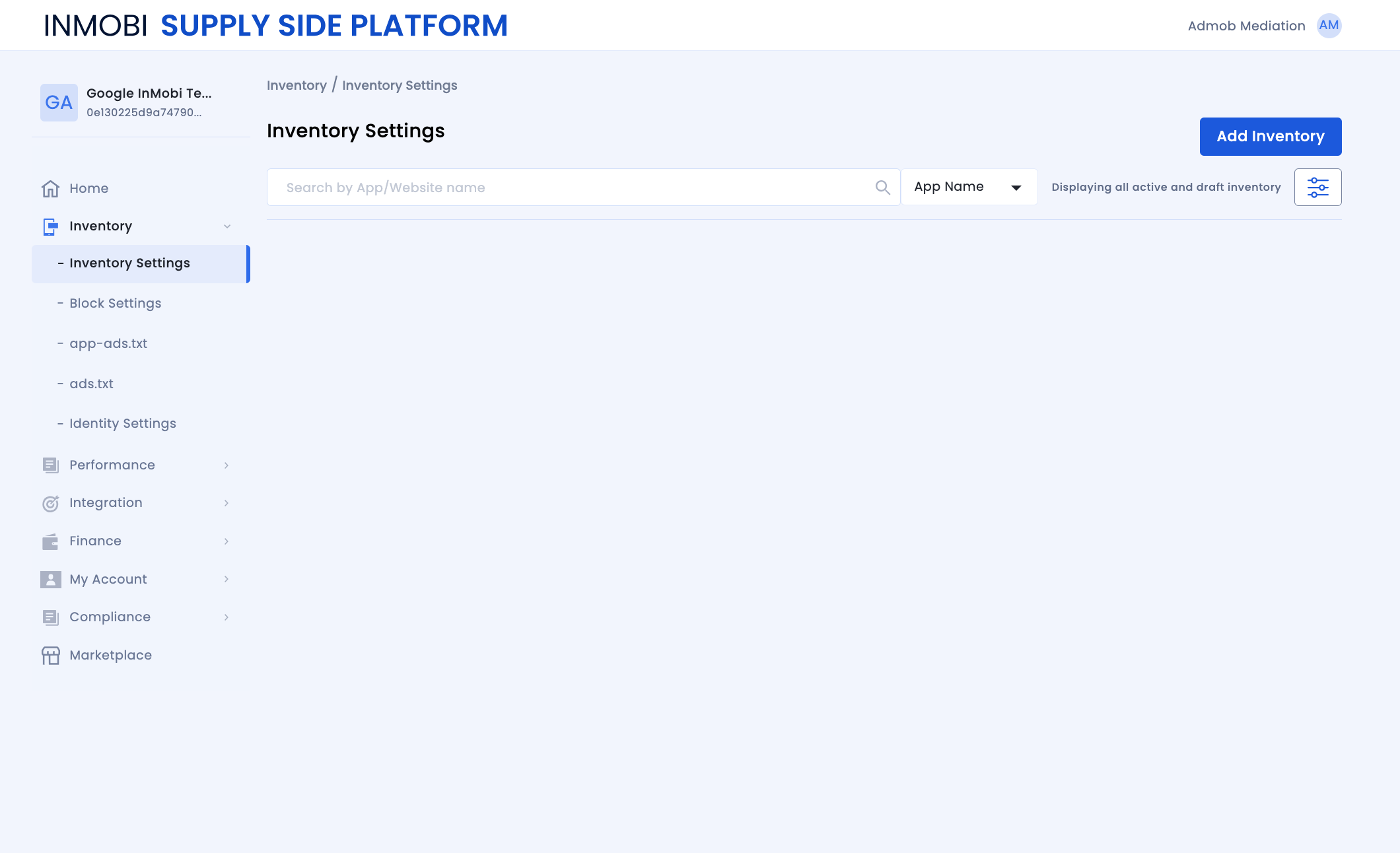 Untuk menambahkan aplikasi Anda ke dasbor InMobi, klik Inventaris > Setelan Inventaris.